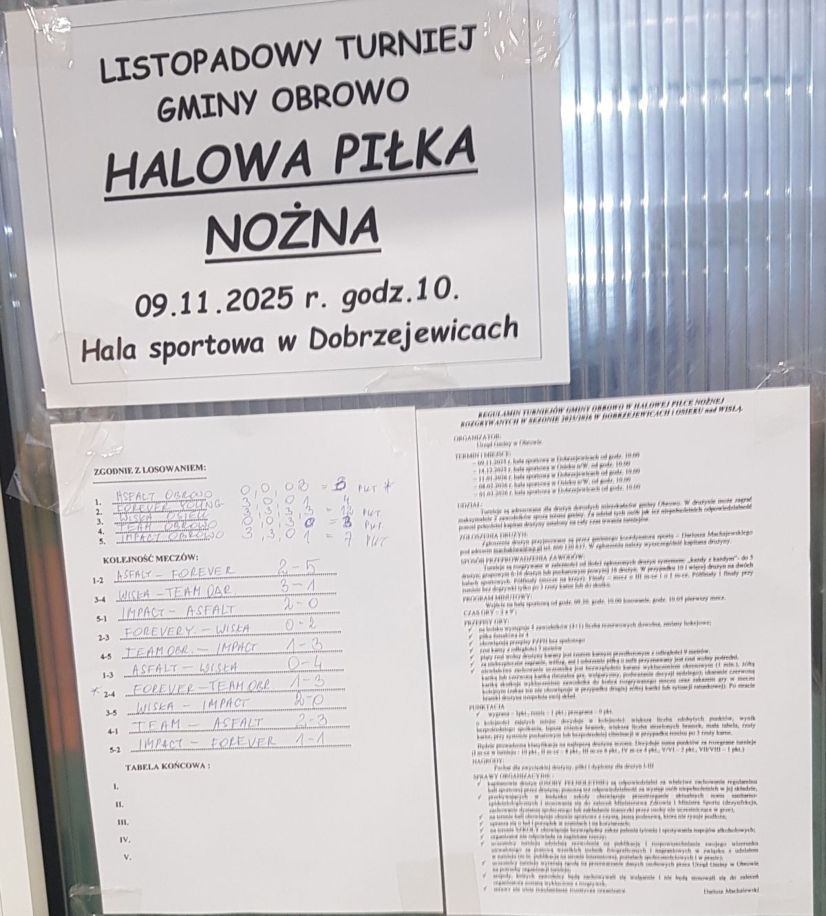 W 1. turnieju halowej piłki nożnej dorosłych sezonu halowego 2025/2026 rozegranym 09 listopada na hali sportowej w Dobrzejewicach od lat zwanym turniejem Niepodległości wzięło udział pięć drużyn. Zwyciężył zespół Wisły Osiek, który odebrał puchar wójta z rąk Wiceprzewodniczącej Rady Gminy w Obrowie – p. Alicji Tarkowskiej. Drugie miejsce zajął Impact Obrowo, a trzecie – Forever Young z Kawęczyna. Organizator rozgrywek, Urząd Gminy w Obrowie, przeprowadzi drugi turniej 14 grudnia w Osieku nad Wisłą.