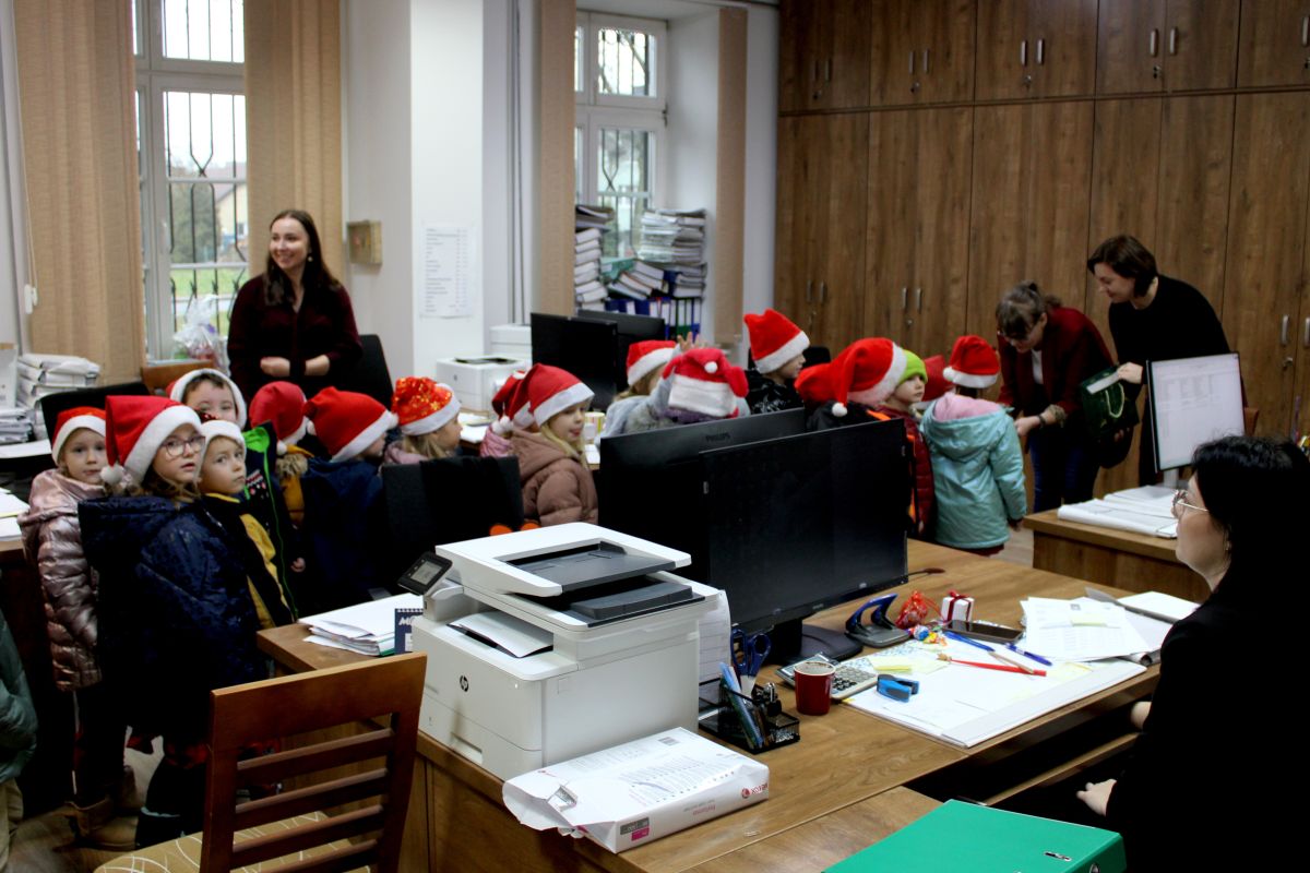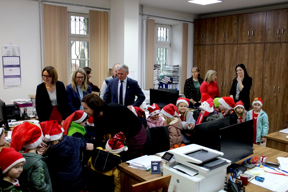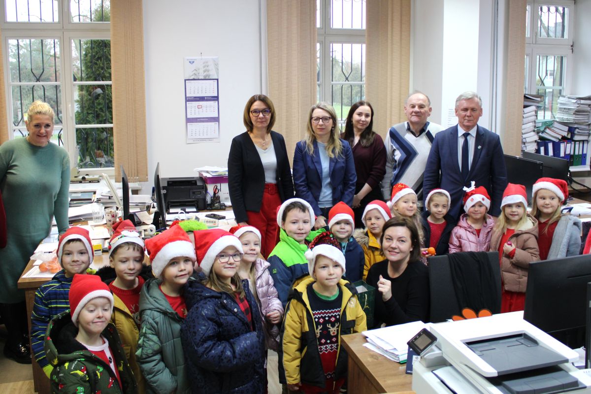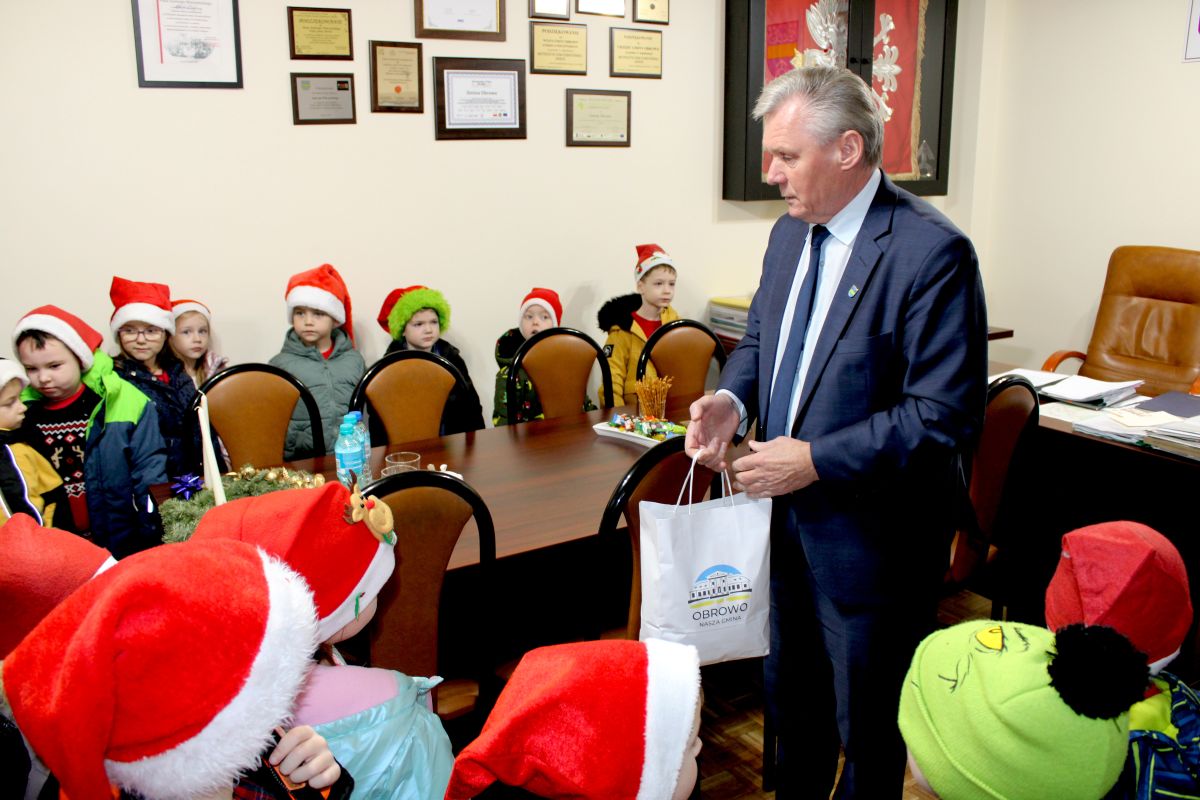 W piątek, 5 grudnia, do Urzędu Gminy w Obrowie zawitała wesoła gromada małych Mikołajów – 5-latków z Niepublicznego Przedszkola „Tęczowa Kraina” w Głogowie. Dzieci ubrane w czerwone czapki i pełne ciekawości przybyły, aby zobaczyć, jak wygląda praca w urzędzie „od środka”.
